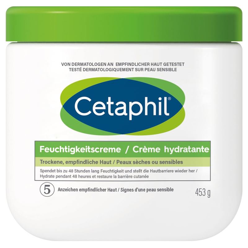 Eigenschaften: Bei sehr trockener und irritierter Haut ist die Hautschutzbarriere meist nicht mehr intakt, wodurch viel Feuchtigkeit verloren geht. Daher brauchen Betroffene eine Reinigung, welche nicht zusätzlich austrocknet sowie eine Pflege, welche dabei hilft, die natürliche Feuchtigkeit wieder herzustellen.Cetaphil Feuchtigkeitscreme mit Mandelöl versorgt trockene bis sehr trockene Haut mit Feuchtigkeit und schützt sie. Dadurch ist dies eine perfekte Pflege für Zonen, die besondere Aufmerksamkeit verlangen wie Hände, Ellbogen und Füsse. Sie enthält besondere Wirkstoffe, welche die Haut sanft und geschmeidig machen, wobei spezielle Feuchtehaltfaktoren die Feuchtigkeit in der Haut binden und auf diese Art ein Austrocknen verhindern.