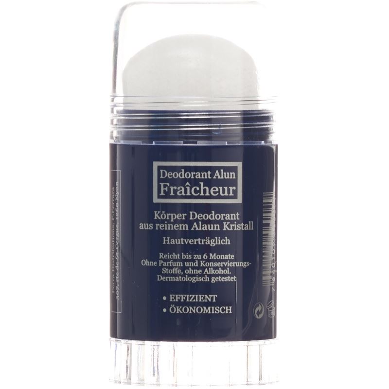 Eigenschaften: <em>Eigenschaften:</em> Ohne Konservierungsstoffe; Ohne Alkohol; Ohne Parfum; Deodorant aus reinem Alaun Kristall; <br/><em>Dosierung:</em> Körper Deodorant; mit Wasser befeuchten und Hautpartien mit exzessiver Transpiration einfach bestreichen (Achselhöhlen, Füsse)<br/>