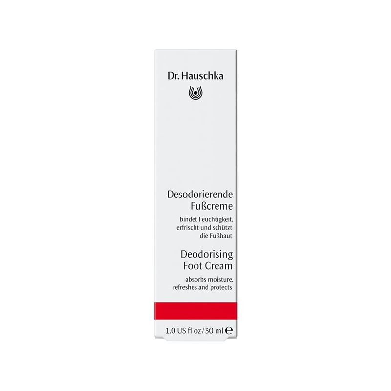 Eigenschaften: Die Dr. Hauschka Desodorierende Fusscreme bindet Feuchtigkeit und sorgt so für ein natürliches Hautmilieu. Sie schützt vor Reibungen, Druckstellen und unangenehmen Gerüchen indem eine feine Puderschicht um den Fuss umhüllt wird. Der erfrischende<br>Wirkkomplex besteht aus ätherischem Rosmarinöl, Salbei, und Echter Goldrute.<ul class="list-bullets"><li>Fusscreme für erfrischende Füsse</li><li>100% Natur</li><li>Enthält Rosmarinöl, Salbei und Echter Goldrute</li><li>Ohne Konservierungsmittel</li><li>Ohne Duftstoffe</li><li>Dermatologisch auf Verträglichkeit getestet</li><li>Ohne Tierversuche</li></ul><h3>Tipp</h3>Bei starkem Fussgeruch wird vor dem Auftragen der Fusscreme, ein <a href="/p/131211/dr-hauschka-salbei-bad-100ml">Fussbad</a> empfohlen.