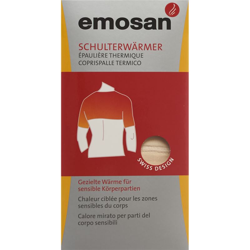 Eigenschaften: Der emosan Schulterwärmer besitzt feine Mikrofasern, welche kleinste Luftkammer bilden. Diese isolieren und halten die Körperwärme zurück, während Hautfeuchtigkeit nach aussen transportiert wird. Dadurch entsteht ein angenehmes und trockenes Wärmegefühl, welches Schmerzen lindert, den Wärmehaushalt regelt und Kühlungen vorbeugt. Dank der anatomischen Passform und dem dehnbaren Material lässt sich die Wärmewäsche ausserdem bequem unter allen Kleidungsstücken mit perfektem Tragekomfort tragen.<h3>Indikationen</h3>Bei Nackenschmerzen, Verspannungen im Bereich der Schultern und des oberen Rückens.<h3>Grösse</h3>Schulterwärmer S : - 94 cm<h3>Material</h3>Aus hautfreundlicher Microfaser. 97% Polyester, 3% Elastan. Waschbar bei 40 Grad. Nach OEKO-TEX® Standard 100.