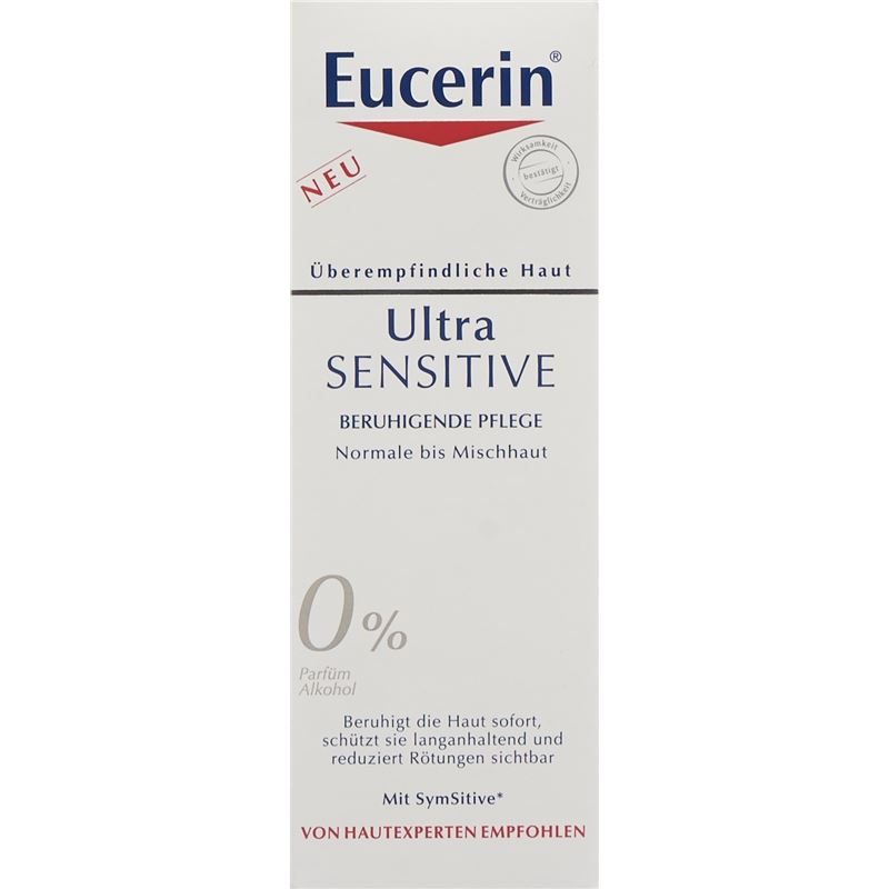 Eigenschaften: Eucerin Ultra Sensitive ist eine beruhigende Pflege für überempfindliche Normal- und Mischhaut. Die Haut wird sofort beruhigt, langanhaltend geschützt und die Rötungen sichtbar reduziert. Das hochwirksame SymSitive, das als Empfindlichkeits-Regulator am Ursprung der Überempfindlichkeit wirkt, beruhigt die Haut sofort und schützt.<br>Die Haut wird dabei optimal mit Feuchtigkeit versorgt und geschmeidig gepflegt.<ul class="list-bullets"><li>Zieht schnell ein</li><li>Nicht komedogen</li><li>Ohne Parabene, Paraffine und Parfüm</li><li>Ohne Konservierungsstoffe, Emulgatoren, Alkohol und Farbstoffe</li><li>Anti-Kontaminierung</li><li>Höchste Verträglichkeit</li></ul>
