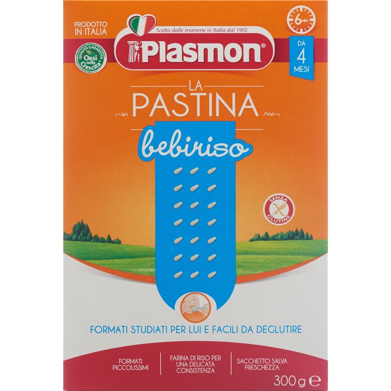 Brand: Plasmon Abpackung: 300 G Eigenschaften: Ab 4 Monaten. Enthält Gluten.<ul><li>Aus feinem Reismehl, welches einfach zu verdauen ist.</li><li>Ohne Konservierungsstoffe und -farben</li><li>Mit Calcium, Eisen und 4 Vitaminen</li><li>Extra kleine Form</li></ul>