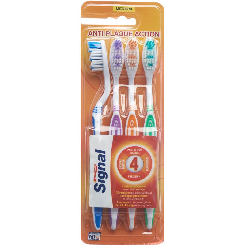 Eigenschaften: Mit dem Signal Anti-Plaque Action Family Pack haben Sie gleich vier Zahnbürsten zuhause, sodass Sie jede neue Jahreszeit mit einer neuen Zahnbürste in perfektem Zustand beginnen können. Die unterschiedlich hohen Borsten garantieren eine effiziente Reinigung bis in die Zahnzwischenräume, wobei sie für den Schutz von Zahnschmelz und Zahnfleisch abgerundet sind.