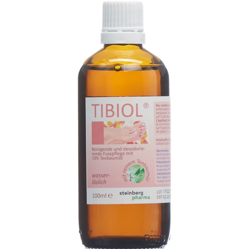 Brand: tibiol Abpackung: 100 ML Eigenschaften: Reinigende und desodorierende Fusspflege mit 10% Teebaumöl. Darf nur verdünnt im Verhältnis 1:10 angewendet werden. Eignet sich auch als Fussbad (1-2 Esslöffel auf 5 Liter Wasser)