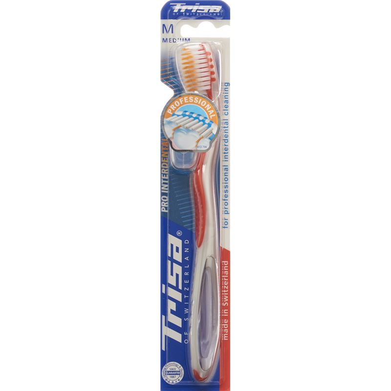 Eigenschaften: TRISA bietet eine umfassende Produktpalette an hochwertigen Zahnbürsten. Dabei werden Funktionalität und höchster Anwendungskomfort für die tägliche Zahnpflege vereint. Die weichen Borsten stimulieren sanft das Zahnfleisch und reinigen gleichzeitig die Zahnoberfläche. Entwickelt und hergestellt in der Schweiz.<ul><li>Seidenfeine Interdentalborsten reinigen tief in die Zahnzwischenräume und massieren sanft das Zahnfleisch</li><li>Kürzere Cleaning-Borsten befreien die Zahnoberflächen zuverlässig von Plaque</li><li>Ergonomischer Griff mit rutschfester Oberfläche</li><li>Weiche Mikrostrukturen auf der Rückseite helfen Bakterien von der Zunge zu entfernen</li></ul>